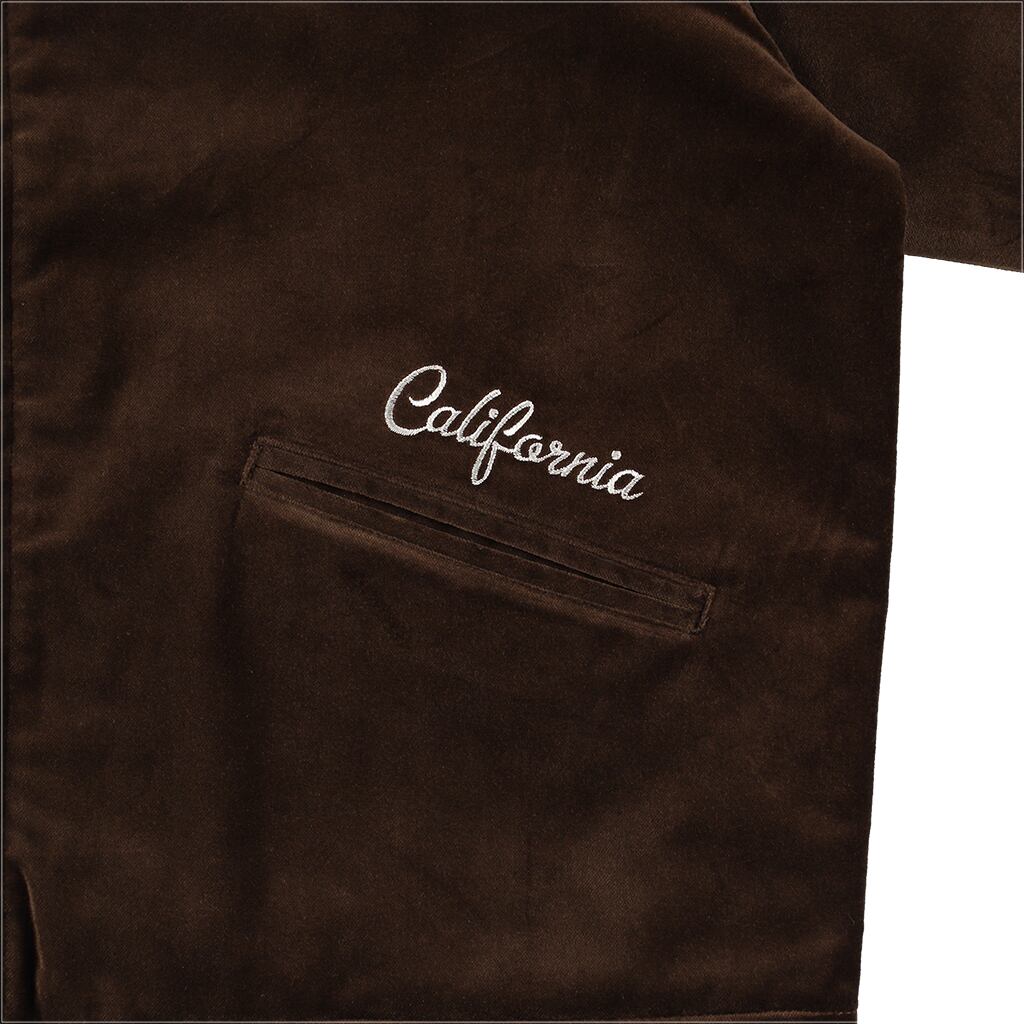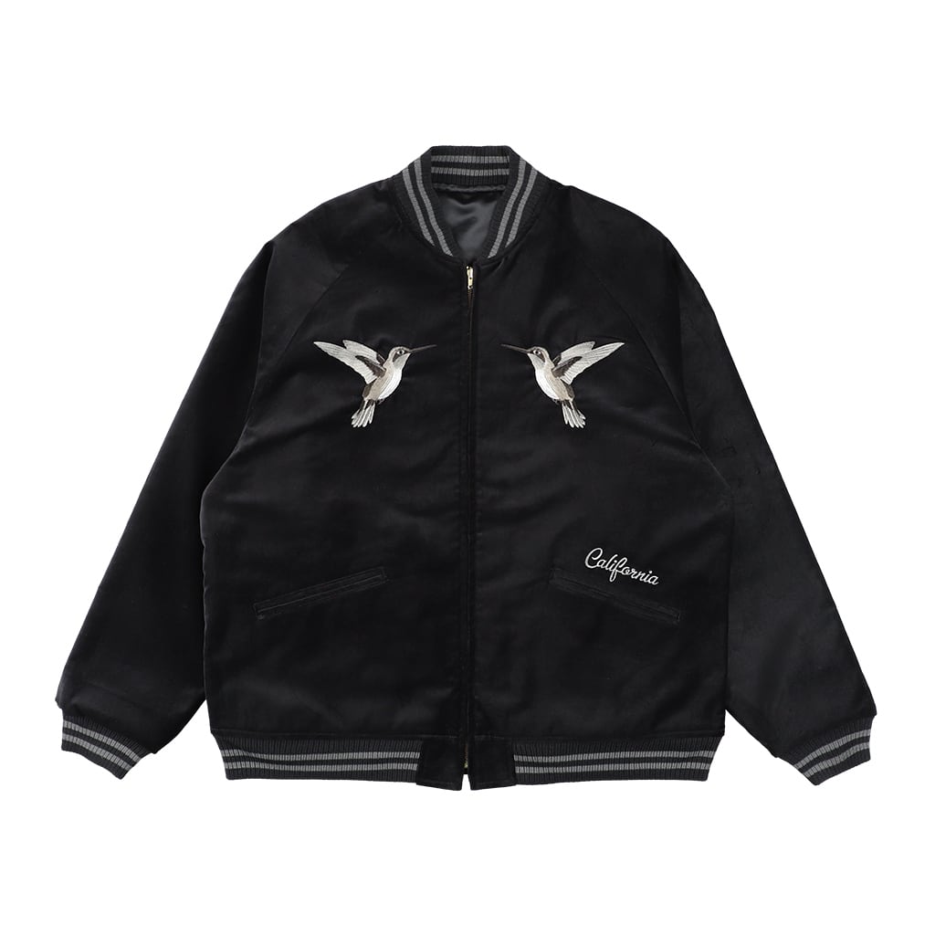 別珍とサテンのリバーシブル仕様で、別珍面は平和で穏やかな雰囲気のカリフォルニアをイメージしたスーベニア刺繍、サテン面はスポーツの盛んなカリフォルニアをイメージしたスタジャン仕様のロゴパッチ刺繍にて仕上げました。
